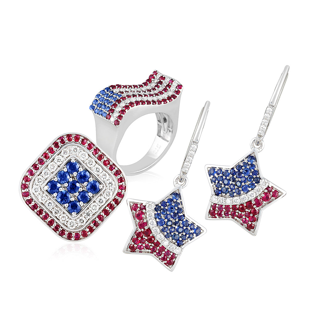 This is our collection that has a focus on our Patriotism and incorporates the aspects of the American Flag, The Eagle as well as Red, White and Blue in Genuine Sapphire, Ruby and Diamonds.